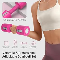 Comfortable, Non-Slip Grip — Designed for Secure Handling:The adjustable dumbbells are designed to fit comfortably in both men’s and women’s hands,featuring a soft, anti-slip TPU handle for a more delicate, sweat-proof grip. Even with sweaty palms, you can maintain a firm hold without slipping.The ergonomically curved central bar is easy and comfortable to hold for extended workouts.The streamlined shape and soft color scheme make this dumbbell set for women not only practical but also a stylish fitness essential. Its ergonomic grip design ensures every workout is more comfortable and enjoyable.